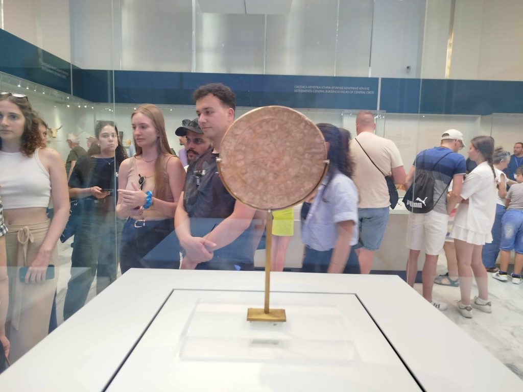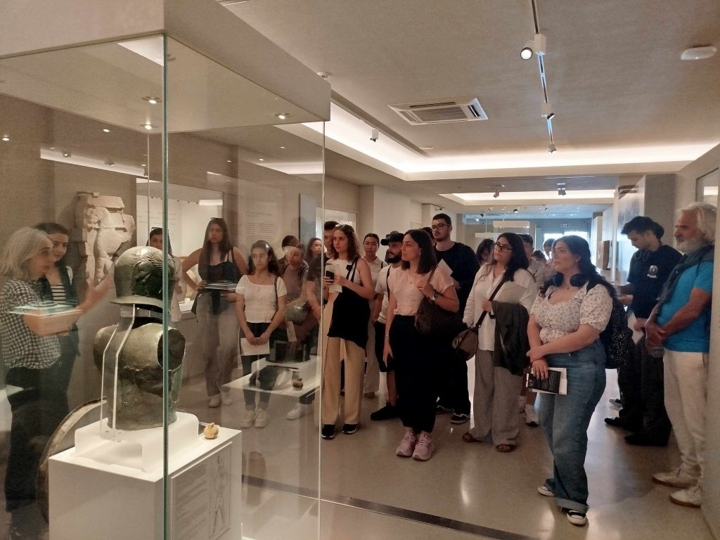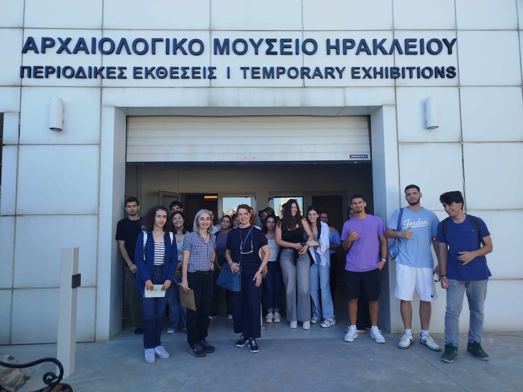 Στο Αρχαιολογικό Μουσείο Ηρακλείου (Α.Μ.Η.) οι φοιτητές παρακολούθησαν ξενάγηση στη μόνιμη συλλογή και στην περιοδική έκθεση “Εκατόμπολις. Ο κόσμος της αρχαϊκής Κρήτης“, από τη δρ. Ειρήνη Γαλλή, τμηματάρχη εκθέσεων του Α.Μ.Η. Με επιστημονικό και άμεσο λόγο μας παρουσίασε πτυχές του λαμπερού μινωικού πολιτισμού και στη συνέχεια, τη συναρπαστική ιστορία της ίδρυσης και ανάπτυξης των πόλεων στην Κρήτη, κατά την Αρχαϊκή περίοδο (7ος – 5ος αιώνας π.Χ.), περίπου 500 χρόνια μετά το τέλος του Μινωικού κόσμου, μια λιγότερο γνωστή περίοδο της Κρητικής αρχαιολογίας και ιστορίας.